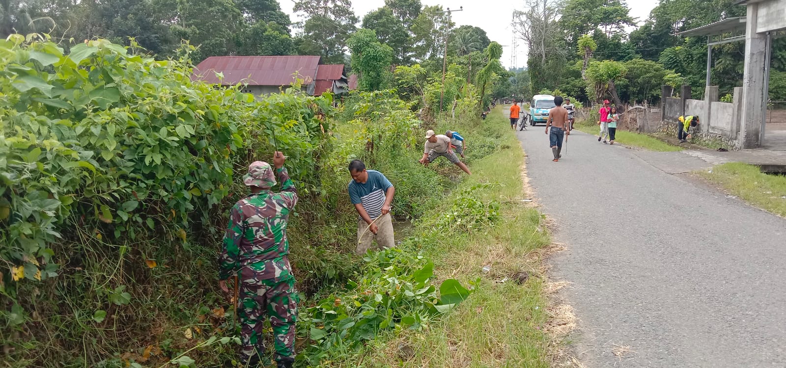 Babinsa Desa Langkidi,Serda Nadimin bersama kepala desa dan masyarakat Desa Langkidi melaksanakan pembersihan saluran air serta rumput liar dan semak belukar yang menutup aliran air.