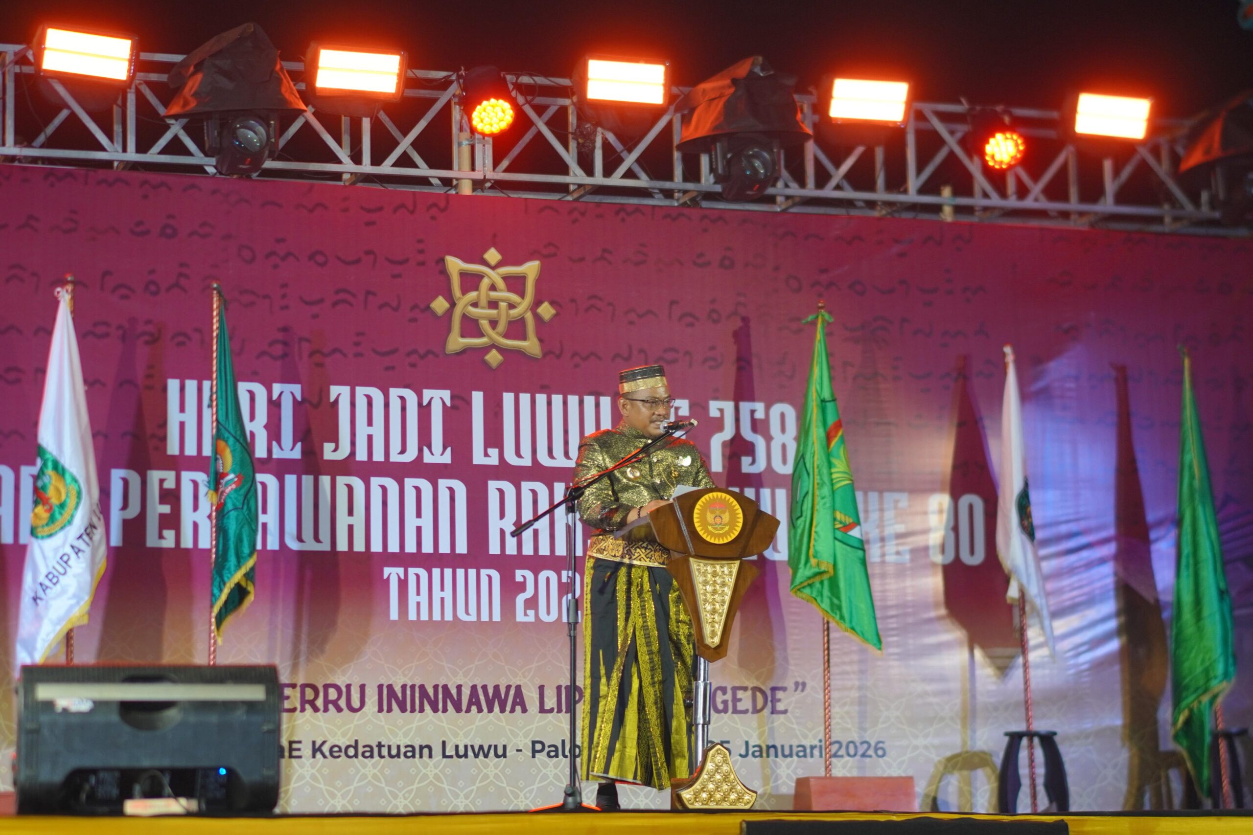 Bupati Luwu, Patahudding, menyampaikan nilai sejarah dan budaya Luwu pada malam puncak peringatan Hari Jadi Luwu (HJL) ke-758 dan Hari Perlawanan Rakyat Luwu (HPRL) ke-80 yang dirangkaikan dengan jamuan makan malam bersama Forum Silaturahmi Keraton Nusantara (FSKN) di Istana Kedatuan Luwu, Kota Palopo, Jumat (23/1/2025).