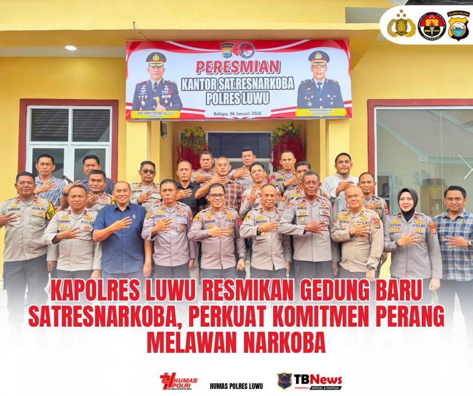 Luwu, Gerbongnews.co.id– Kapolres Luwu AKBP Adnan Pandibu, S.H., S.I.K., meresmikan gedung baru Kantor Satuan Reserse Narkoba (Satresnarkoba) Polres Luwu yang berlokasi di dalam kompleks Mapolres Luwu, Selasa (06/12/2025).