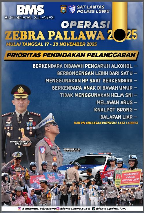 LUWU, Gerbongnews.co.id – Polres Luwu melalui Satuan Lalu Lintas akan melaksanakan Operasi Zebra Pallawa 2025 yang digelar serentak di seluruh Indonesia mulai 17 hingga 30 November 2025. Operasi ini merupakan agenda nasional untuk meningkatkan kesadaran dan kepatuhan masyarakat terhadap aturan berlalu lintas serta menekan angka kecelakaan di seluruh wilayah hukum Polri.
