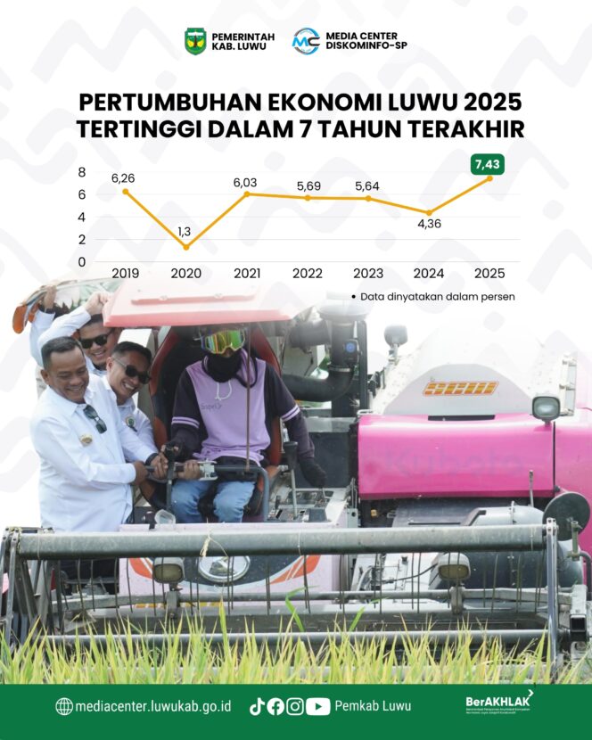 KAB LUWU, GerbongNews. co.id -Pertumbuhan ekonomi Kabupaten Luwu tahun 2025 mencapai 7,43 persen berdasarkan data Badan Pusat Statistik (BPS) Kabupaten Luwu. Capaian ini menjadi yang tertinggi dalam tujuh tahun terakhir sekaligus menandai momentum pemulihan ekonomi daerah.